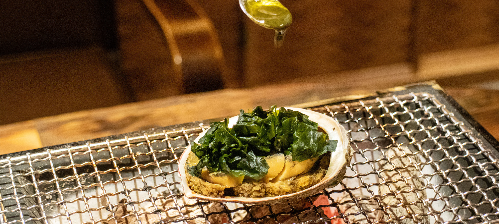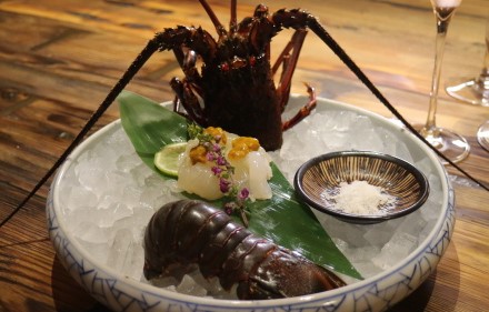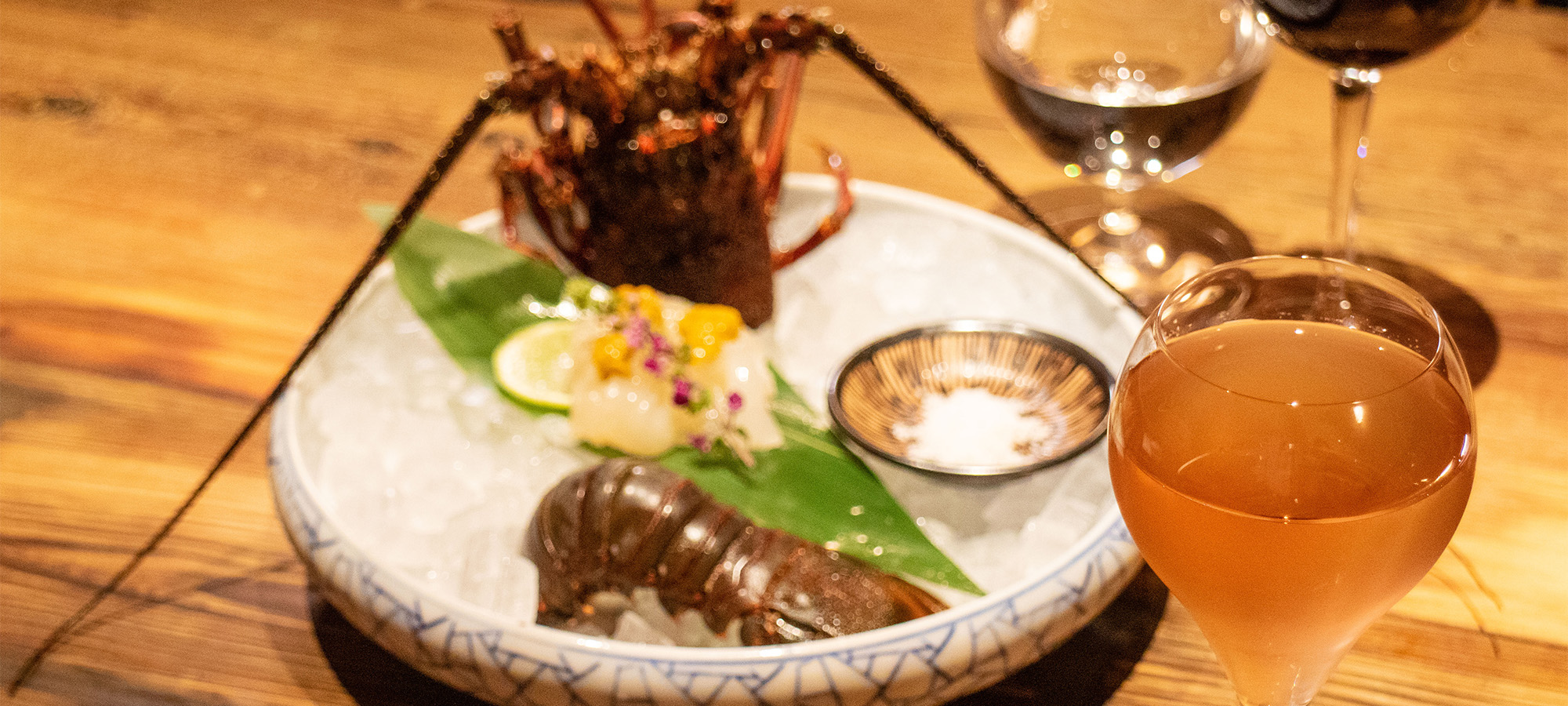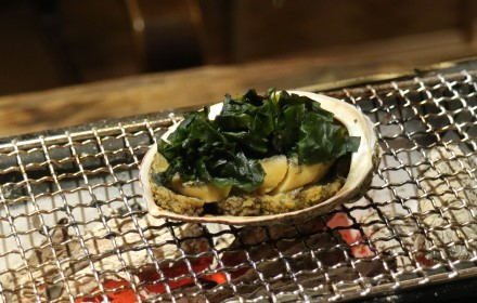 | 伊勢海老の活き造り丸ごと一尾 | あわび炭焼き | 肝ソース丸ごと一パイ | |||